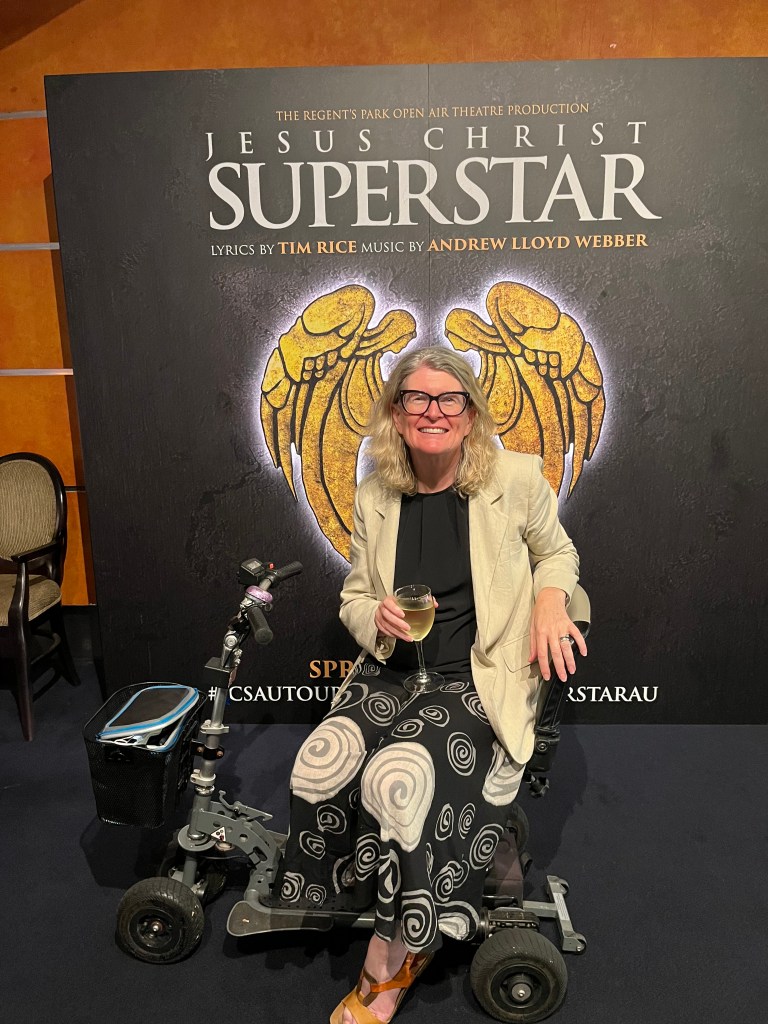 Find a small portable mobility scooter for this adventure. From taking public transport or putting it in a car, portable is the only way. Even at the theatre you will need a smaller scooter with a good turning circle as the disabled toilet is not very wide so you need to reverse rather than turning around to get out.