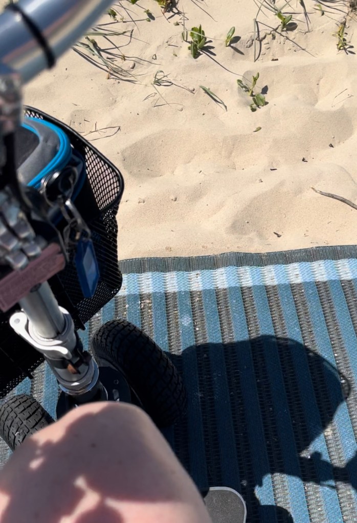 In a recent post I’m was taking my scooter onto the mobi-mat on the beach. Well not all the way. I had to do a 3 point turn to make my way back up. I’m wondering how any other scooter could do it. It’s a squeeze even for me. Once you hit soft sand it’s all over red rover. It’s not like I can just get up and walk away. I’m stuck.