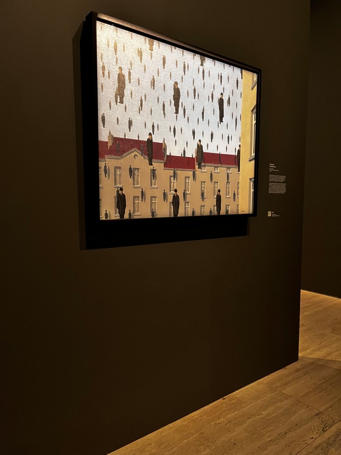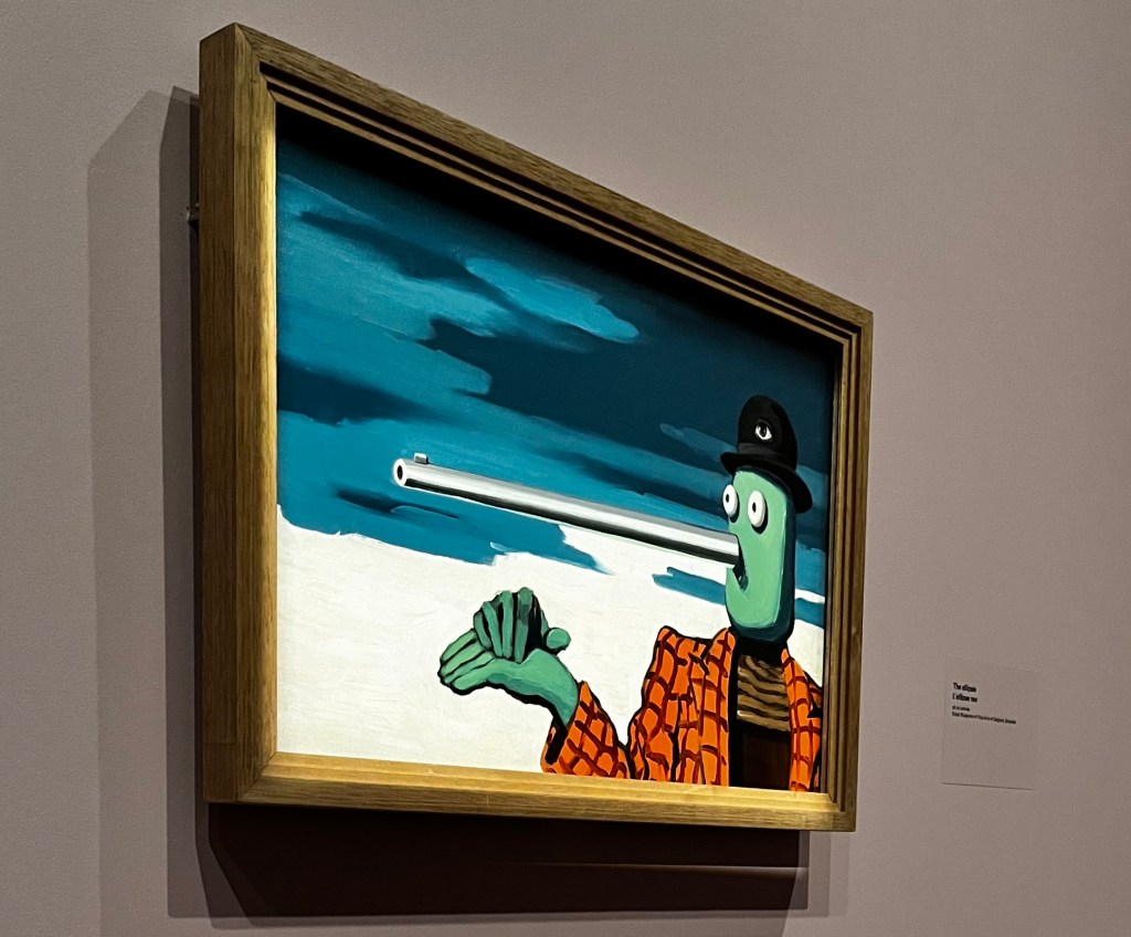 It was just so interesting to see the diversity of his work. Nothing stuffy here. I think the ones we had the most fun with was one we named ‘It’s raining men’ (Golconda) and another we called ‘Gunby’ (The Ellipsis) where a green figure, that looks alot like a toy called Gumby that we used to play with we were kids. The nose was a gun…hence Gunby.