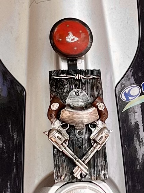 One of them has pimped their ride. They have added badges. There’s a Holden car badge and a gunslinger badge on the front pannier. I keep reminding myself I need to add some bling but I never do.